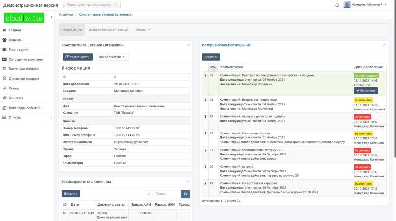 Cloud 24CRM дозволить фіксувати всі контакти з клієнтами, контролювати своєчасність зустрічей та дзвінків. Картка клієнта містить повну історію взаємовідносин – від знайомства до поточних угод.